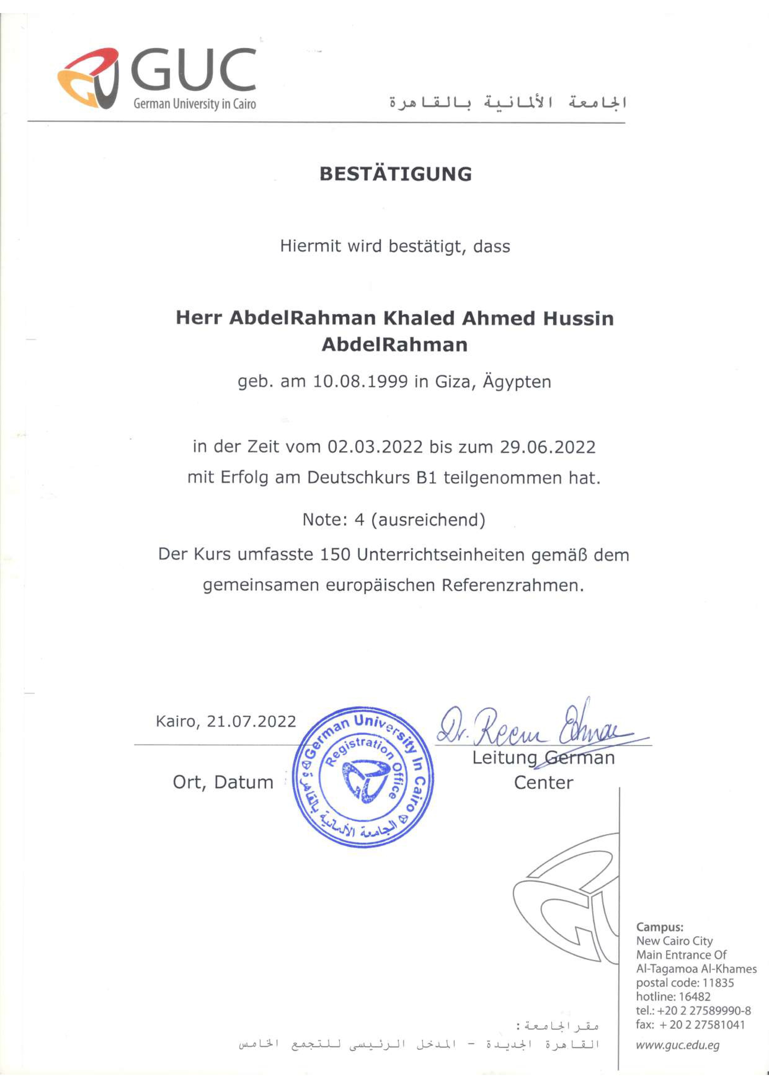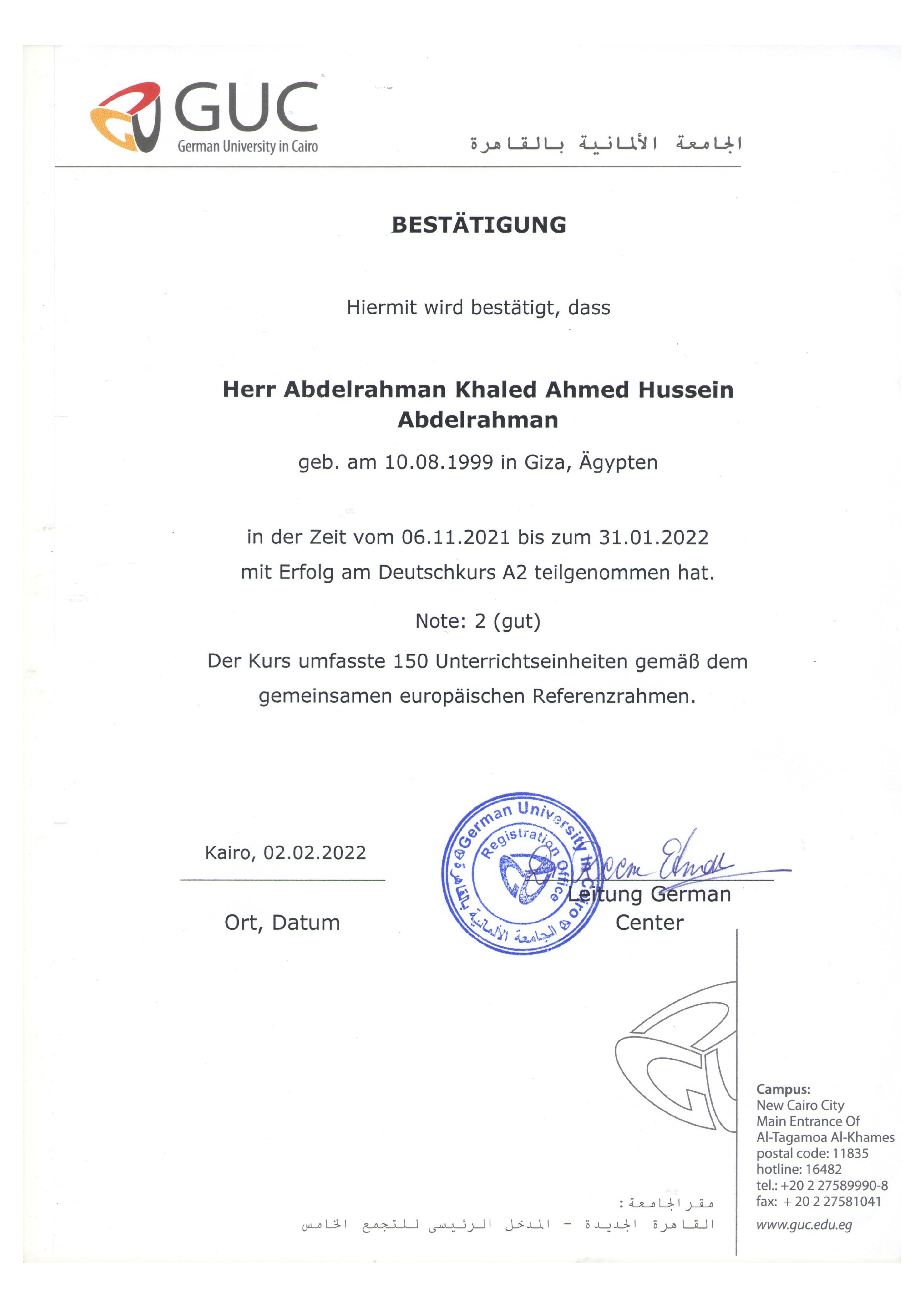 "I have known Abdel during my tenure at the German university in Kairo. He enrolled in multiple courses I taught there. He also contributed to the smart autonomous bike research cluster that I have set-up and managed. We published a scientific paper together based on his work. Abdel is a team player and very friendly. Based on our experience together, I can confidently recommend Abdel for both his engineering and soft skills."
